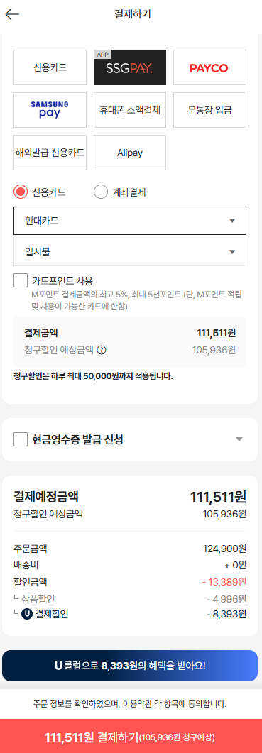 저번에 인터넷 풀린이후로 할인이 애매해서 안올렸는데.. 혹시 지금 구매하실분들은 참고하세요 현재 쓱에서 기본 상품할인 + 쓱유니버스할인쿠폰 7% (무료가입가능) 적용시 111,511원, 여기에 현대카드 5% 청구할인시 105,936원입니다