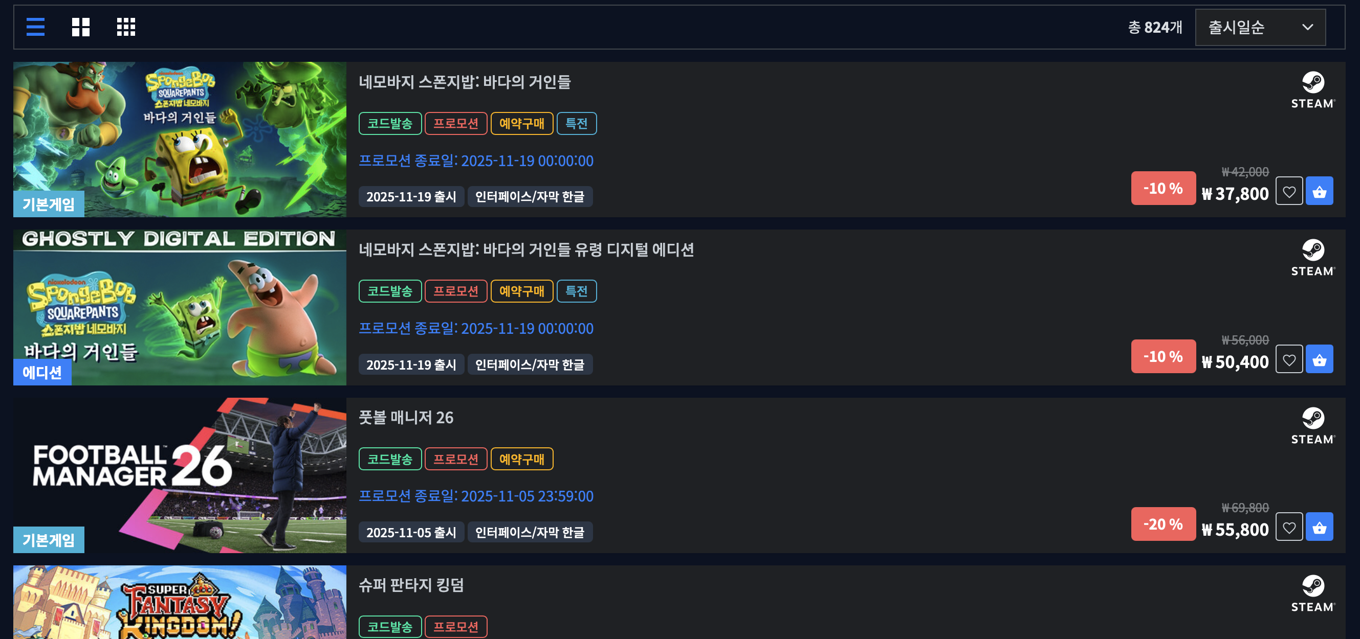 다이렉트 게임즈는 보기 디폴트 옵션으로 썸네일 제거옵션(텍스트 한줄에 게임 한개)을 꼭 넣어 적용해 주길 부탁드림... 오늘도 첫 페이지부터 숨막혀서 스크롤도 안내리고 에혀~ 하고 나옴
