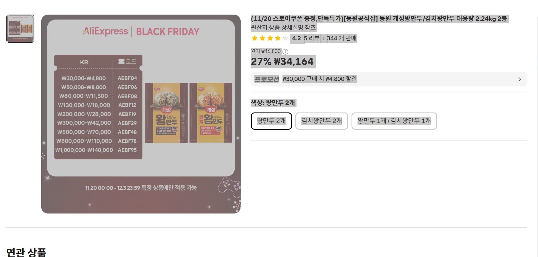 알리익스프레스 (동원 공식 스토어) 에서 블랙 프라이데이 할인행사로