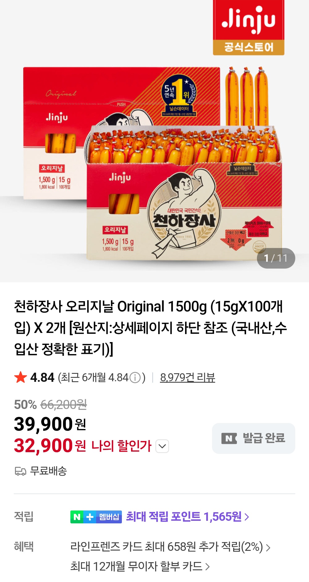 진주햄 천하장사 오리지날 소시지 15gx100개입 X 2개 쿠폰 여러개 적용하면 32,900원 + 3만원이상 결제시 6,300원