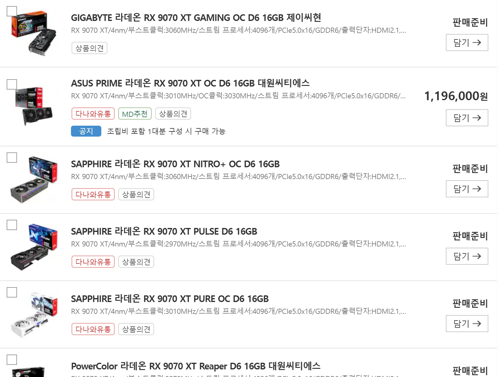 다나와 사이트에서 완본체 하나 구성으로 사지 않으면 9070XT 를 저 가격에 안판다는 이야기입니다. | 25.03.15 14:17 | |