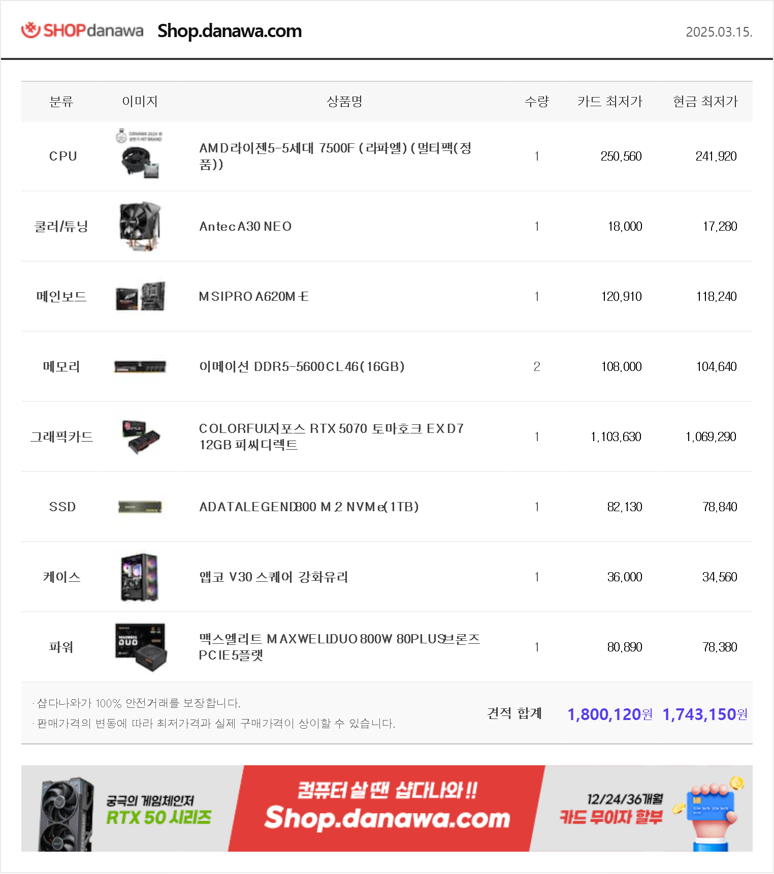 혹시 180만원 정도의 견적하구 지포스 계열로도 견적 부탁드려도 괜찮을까요?? | 25.03.15 21:58 | |