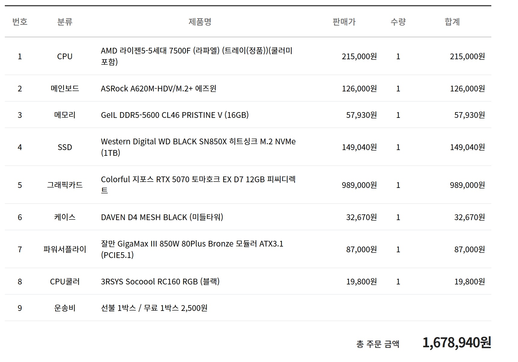 현금 구매로 하실거라면 메모리 - ESSENCORE KLEVV DDR5-5600 CL46 NEO 파인인포 (16GB) 2개 SSD - Western Digital WD BLACK SN850X M.2 NVMe (1TB) 로 바꾸는게 좋을 듯 합니다 | 25.03.15 23:11 | |