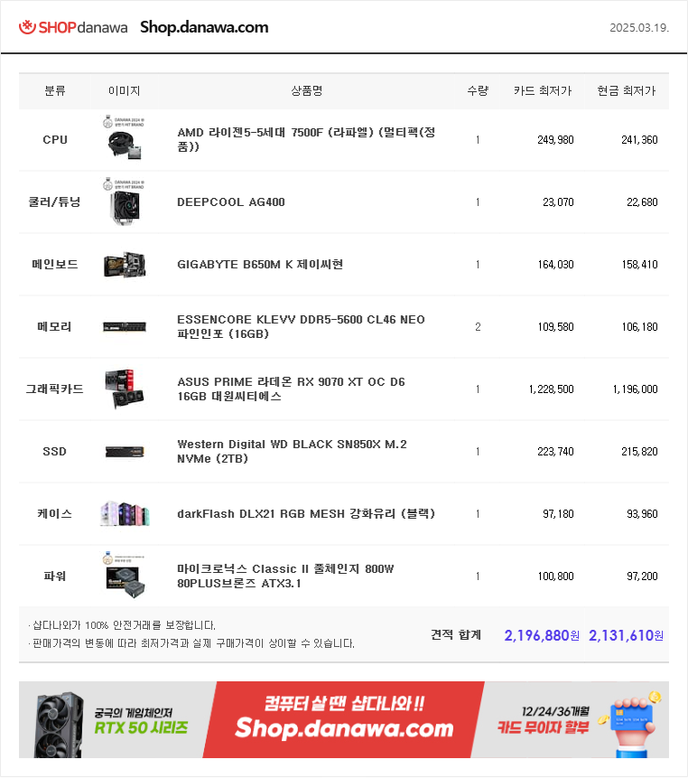 지난 글에서 제가 9600, 9600x, 9700x 를 권해드렸죠. 그리고 벤치마크 링크들도 드렸었죠. 9600x 와 9700x 의 4K 게임 성능차이가 사실상 없는거 확인하셨을겁니다. 그럼에도 9700x 를 고르셨구요. 이게 아예 의미가 없진 않을겁니다. 아무래도 6코어와 8코어의 차이가 있다보니 게임 외에 뭔가를 다중실행 시켰을 때에 조금 더 여유가 있을거고 혹여나 모바일게임 안드로이드 에뮬레이터를 돌린다거나 영상편집 같은 작업을 한다거나 할 때에 8코어쪽이 유리한 부분이 있을겁니다. 하지만 그럼에도 30만원대 vs 50만원대의 차이는 작은 금액은 아니구요. 이 차이는 누가 결정해 줄 수 있는 부분이 아니니까 내가 저 20만원을 더 내고 8코어를 갈 필요가 있는지는 스스로 판단하세요. CPU 쿨러는 9600x 나 9700x 모두 2~3만원짜리 듀얼타워 공랭으로도 가능합니다. 조금 더 쓴다 해도 5만원대쯤의 듀얼타워 공랭이면 충분합니다. 이런 CPU 에 굳이 수랭쿨러를 쓰는 경우는 내부가 비쳐보이는 어항케이스를 쓰는 경우에 공랭쿨러 큼직한게 안에 박혀 있으면 예쁘지 않기 때문입니다. 즉, 외모값입니다. 선택하신 케이스도 마찬가지입니다. 사실 케이스는 성능과 거의 연관이 없는 부분이고 개인이 이 컴을 어디에 놓을지에 따라서 편의성과 공간차지에 대한 부분 약간, 그리고 외형적인 심리적 만족감이 큰 부분을 차지하는 부품이라서 금액을 아끼려 하신다면 4~5만원대 케이스로도 충분합니다. 어항형 케이스를 써서 '예쁜 컴' 을 만들겠다고 하신다면 가급적 모든 부품의 색을 맞추시고 제대로 외형을 추구하시는 쪽을 권합니다. 어항케이스 해놓고 색 얼룩덜룩이고 그냥 번쩍거리는 팬이나 돌아가는 정도인거 그리 좋지 못합니다. 물론 다시 말씀드리지만 이런 외형적인 부분은 개인의 미적, 심리적 만족도가 큰 부분을 차지하기 때문에 타인이 함부로 말하기 힘듭니다만 이 쪽에 빠진 컴덕, 매니아들이 굳이 깔맞춤에 눈에 불을 켜고 달려드는 건 결국 그 부분에 있어서는 그게 가치가 있기 때문입니다. 저는 할거면 제대로 하고 (물론 이거 제대로 갈거면 성능만을 위한 견적보다 +20~30만원은 더 들어갑니다) 안 할거면 그냥 어항케이스 포기하고 옆면 덮인 평범한 케이스 쓰고서 돈 아끼는 쪽을 권합니다. 메인보드는 성능만 놓고 본다면 16~20만원 사이의 b650m 보드면 충분하구요. 그 이상 금액의 보드는 '이 보드가 내가 필요한 기능을 제공하는가' 에 초점을 두시기 바랍니다. 아니면 아예 위에 적었던 대로 보드도 외형을 따지고 그 관점에서 보시던가요. 현 시점에서 b850 보드 권하지 않습니다. 어차피 동급의 am5 보드인데 b650 보다 최근에 출시해서 아직 가격에 거품이 있는 편이고, 그 돈을 주고 굳이 850 을 선택해서 얻는 이점이 없습니다. 같은 가격대 같은 체급의 보드를 보시더라도 b650 에서 보시는 쪽을 권합니다. | 25.03.19 22:43 | |