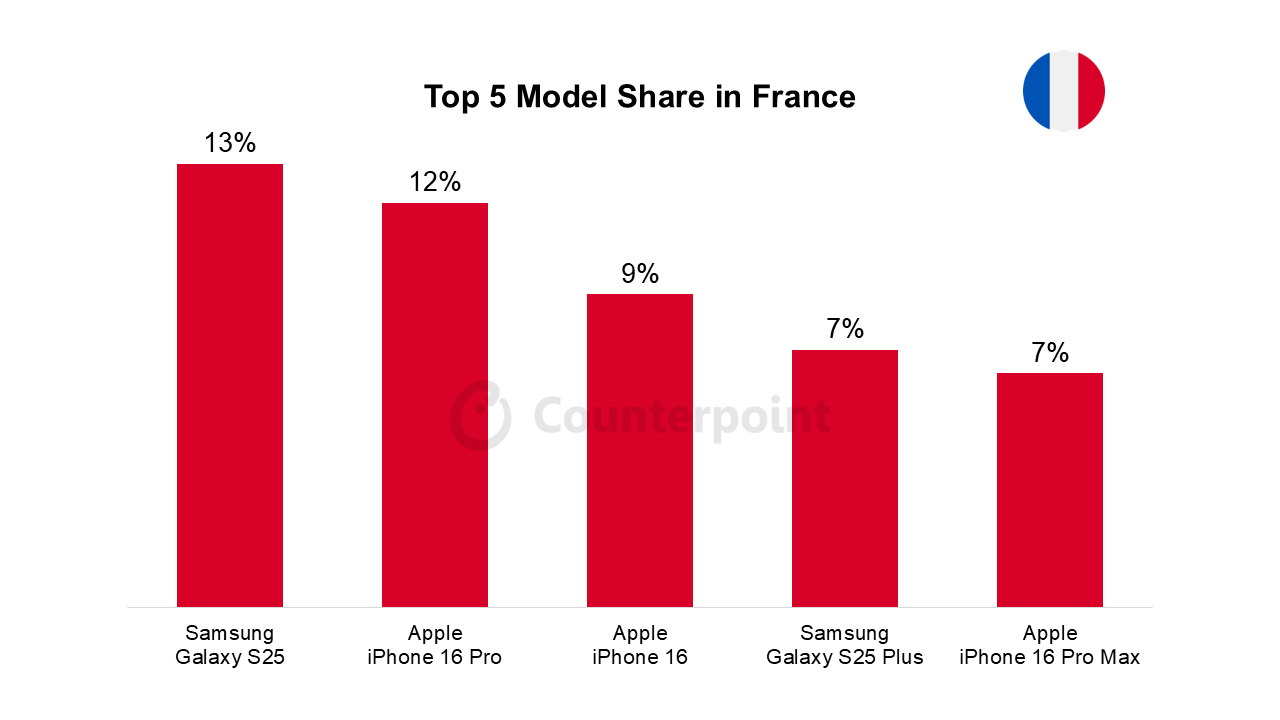 CounterPoint에서는 주요 국가에 대한 가장 최신 스마트폰 모델별 판매량 비율 순위를 발표 했습니다. (25년 3월 기준)