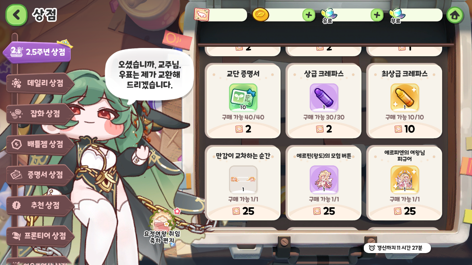 2.5주년 기념 재화인 [에르피엔 기념우표]를 사용하여 다양한 상품을 구매하실 수 있습니다.
