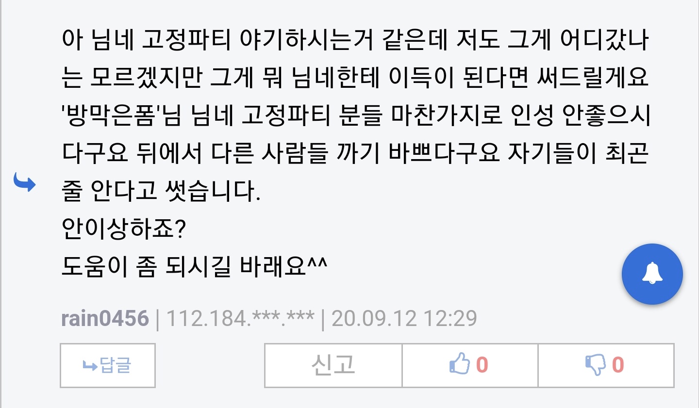 자삭하신 당신의 첫 댓글은 제가 작성했던 본문과 비슷한 맥락의 문제를 갖고있다는 점을 느끼지 못하셨나봅니다. 만약 당신께서 다른분들같이 단순히 제 글의 문제점을 지적하기만 했다면 저는 바로 사과문을 작성했을겁니다. 당신께서 확신한 그 우월감이나 자만감이나 하는 것에 빠진 사람이 이렇게 자신으로 인해 상처받은 사람이 있다면 바로 고개를 숙일리가 없지 않겠습니까 제가 적은 글이 의도한 바와 다르게 사람들에게 전달된것처럼 당신 또한 제게 전달하려는 의도가 무엇이었은 그 첫 댓글은 한참 뒤틀린것이었습니다. 당신께서 폭로라고 생각하며 한 행동은 그저 근거도 없는 거짓된 선동입니다. 위 댓글이 일컬는 '그런 반응'은 당신께서 먼저 뽑아낸것입니다. 본문인 사과문에서의 태도와 당신의 댓글에 달렸던 제 답글에서의 태도 차이를 본인도 느끼시겠죠. 사과드릴 일이 없다고 적으셨는데 다시 한 번 천천히 생각해보세요 | 20.09.13 08:08 | |