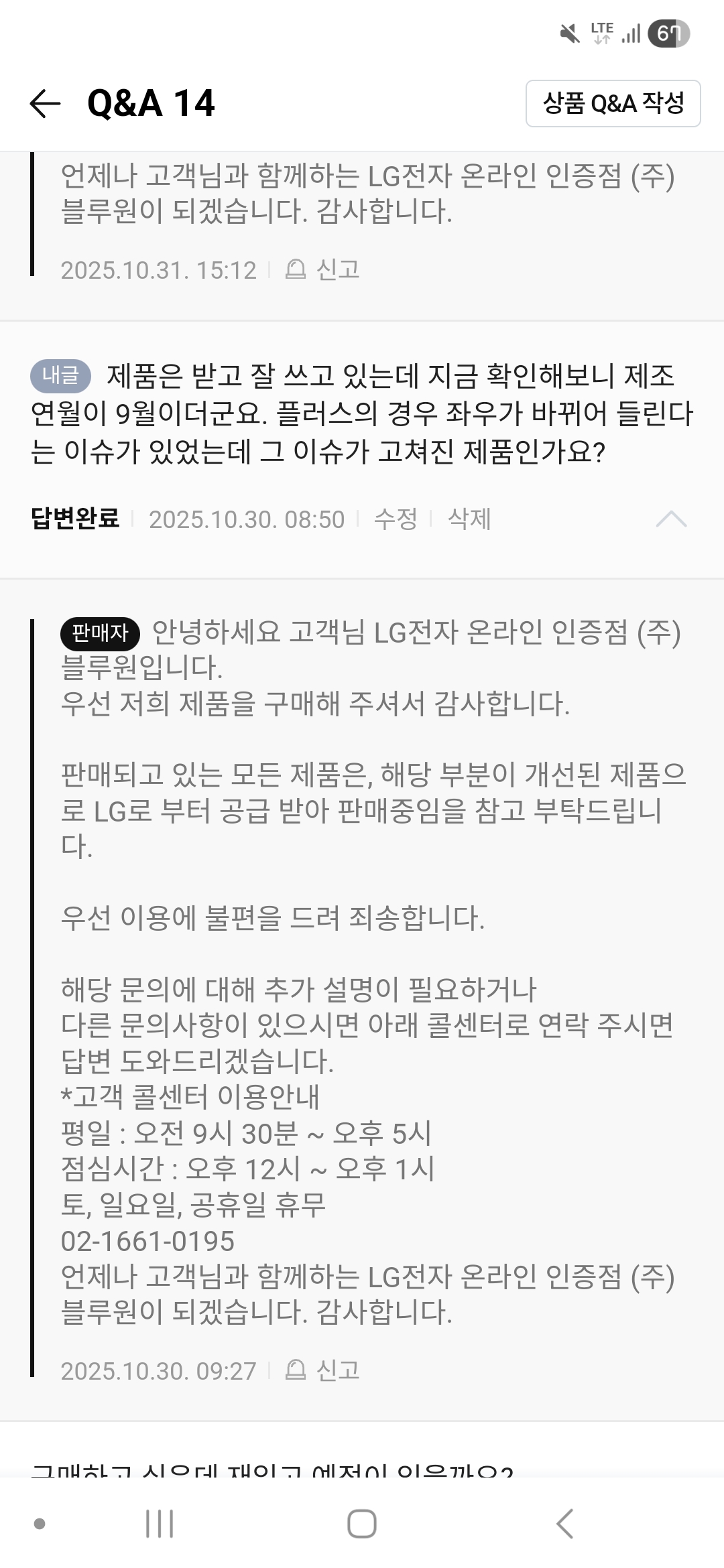 네. 제가 받고 나서 리뷰쓰려고 했더니 제조연월이 올해 9월이어서 여쭤봤더니 해당 이슈는 개선된 거라네요. | 25.11.02 10:34 | | |