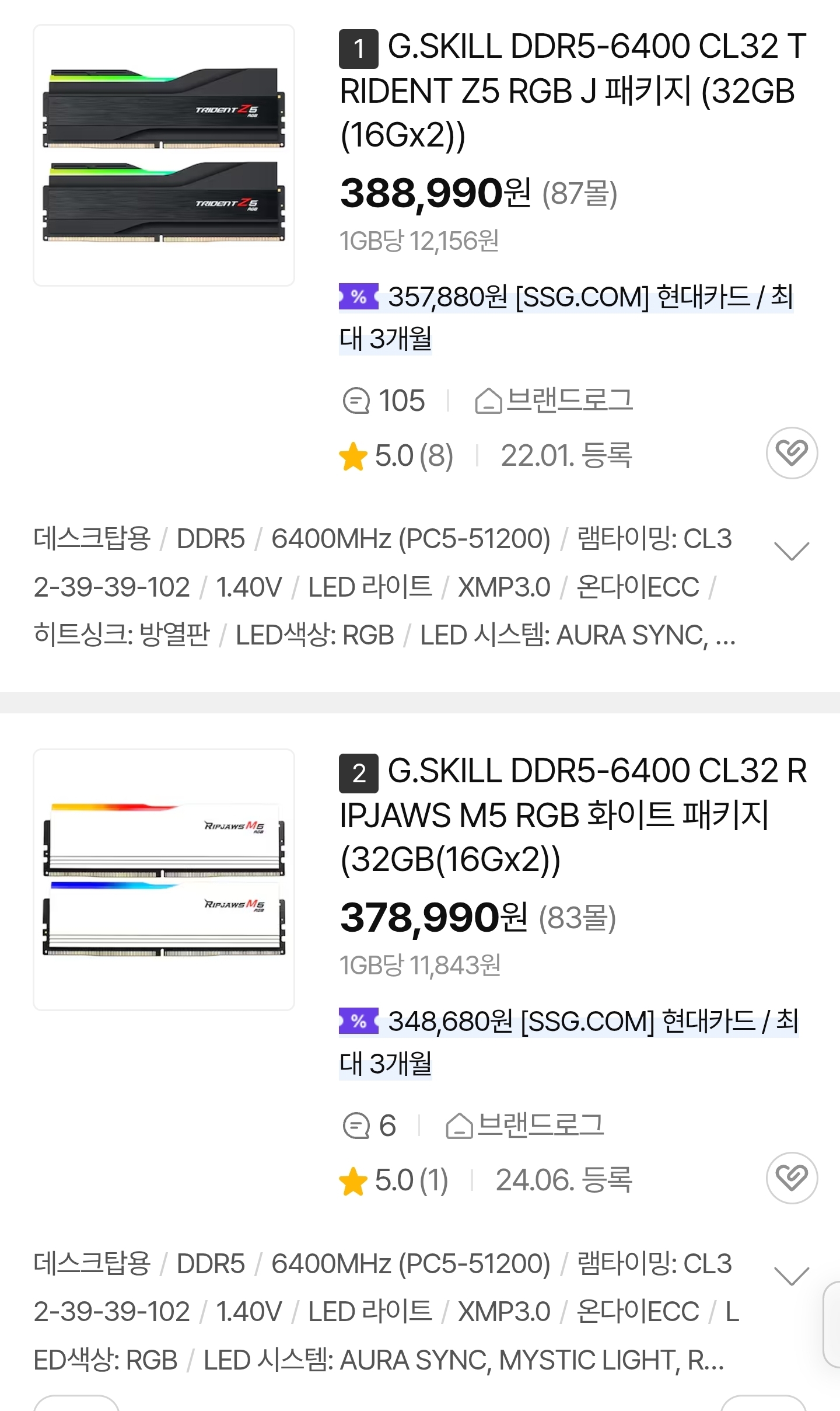 보통 32GB 게이밍 램 가격이 이모양입니다.. 올해 초엔 제가 DDR5 6400 CL30 64GB를 30만원에 샀었어요..