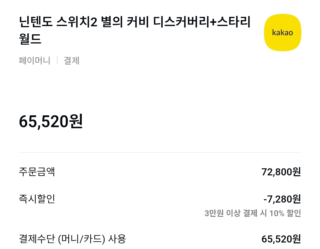 스위치2 있는데 커비 디스커버리 노리시는 분은 저거 말고 검색해서 스위치2용으로 사세요 포미 쿠폰 7천원 적용되고 카카오페이 결제할인 받으면 65520원에 살수 있어여! 스위치1 칩사서 업글패스 사느니 이건 팩하나로 해결되네요 글쓴이분 쿠폰 정보 감사요