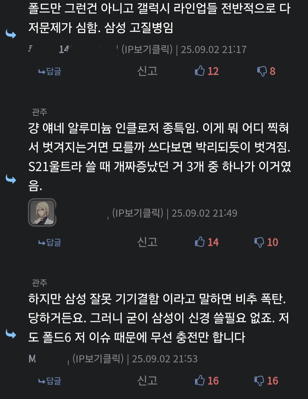 삼성 이노다이징 충전 박리 -> 수년째 해결 못하고 있고 막을 방법 자체가 없음 애플 모서리 긁힘 -> 모든 알루미늄 외장 기기들은 동일 문제가 있고 사용하면서 조심하거나 케이스 끼면 방지라도 됨 정신병이 도대체 누군지 ㅎ | 25.09.24 16:50 | | |