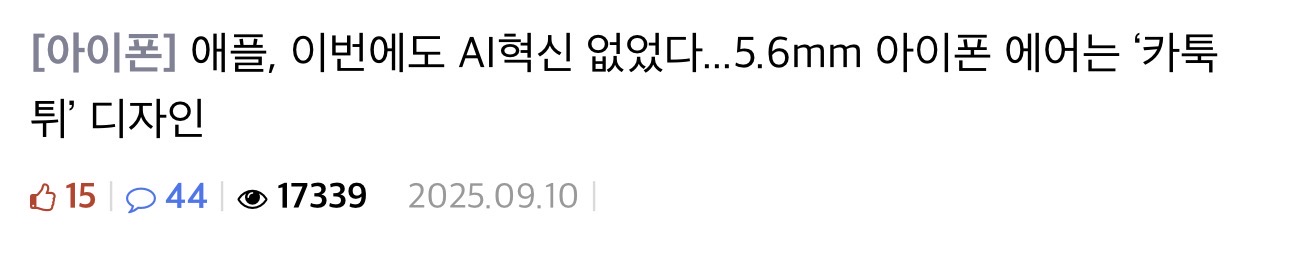 나는 에어, 와이프가 엣지 샀는데, 개인적으로 무슨 생각으로 엣지 만들었는지 모르겠네. 디자인이 그냥 +의 얇은 버전임.. 얇기만 하니까 디자인적인 차별성도 없고, 배터리 광탈하고 그러니까 외면 받는거지. 에어는 카메라, 스피커 과감히 포기하고 대신에 디자인으로 완전히 차별화 건게 다른 층의 수요를 창출했음. | 25.10.18 13:49 | | |