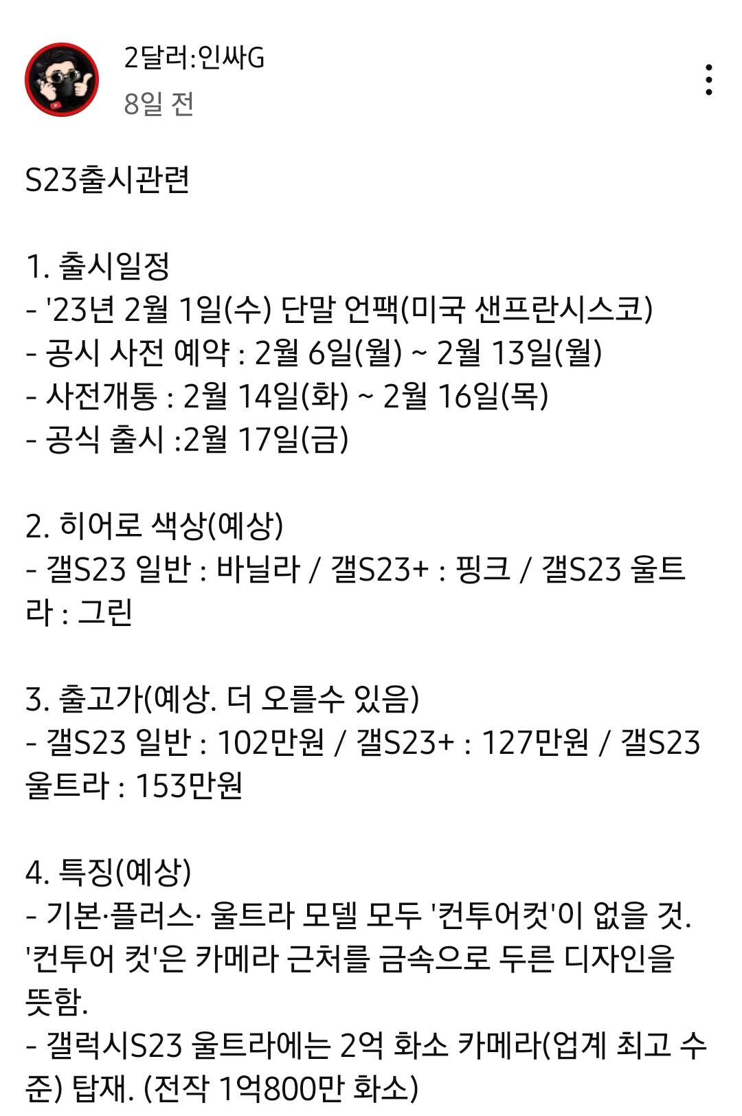 루머의 신빙성은 둘째치고 올리신거는 그냥 판매점 하는사람의 예상(뇌피셜)이고 위에 올라온 루머는 국내 통신사쪽 소스라고 하니.. 물론 그 소스가 신빙성이 있냐 없냐는 또 다른 이야기지만요.. | 23.01.05 17:17 | | |