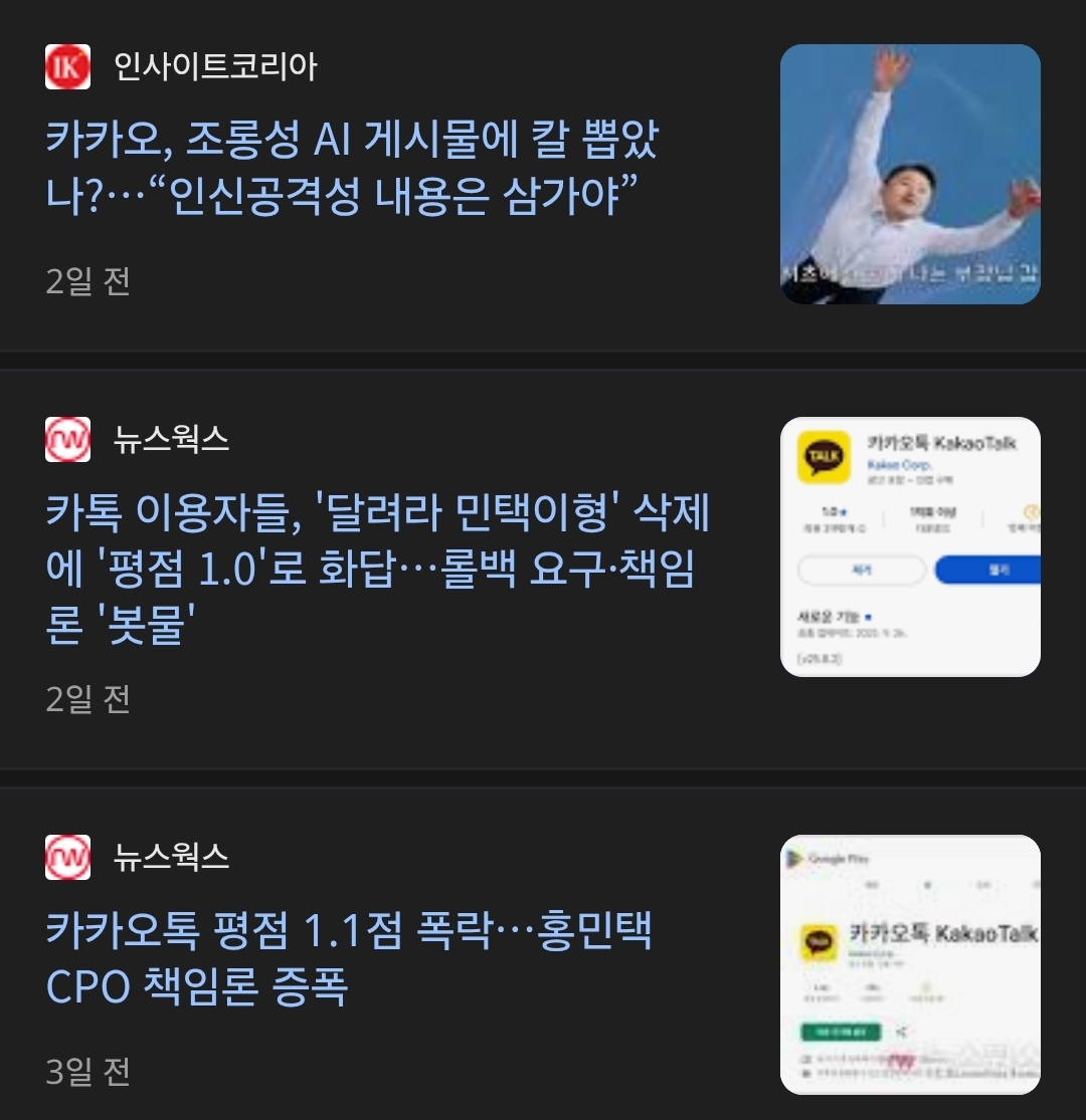 네이트온 싸이월드도 그렇게 순식간에 망할지 아무도 몰랐지 카톡도 대체제는 많은데 굳이? 라는 입장이라 다들 그냥 쓰는거지 한방에 갈라탈수 있고 너도나도 이거다 하고 우르르 몰리는 앱 하나가 뜨면 순식간에 넘어가버릴걸 뭐 그게 전국민적 흐름을 타야된다는게 어렵지만 | 25.10.06 15:56 | | |