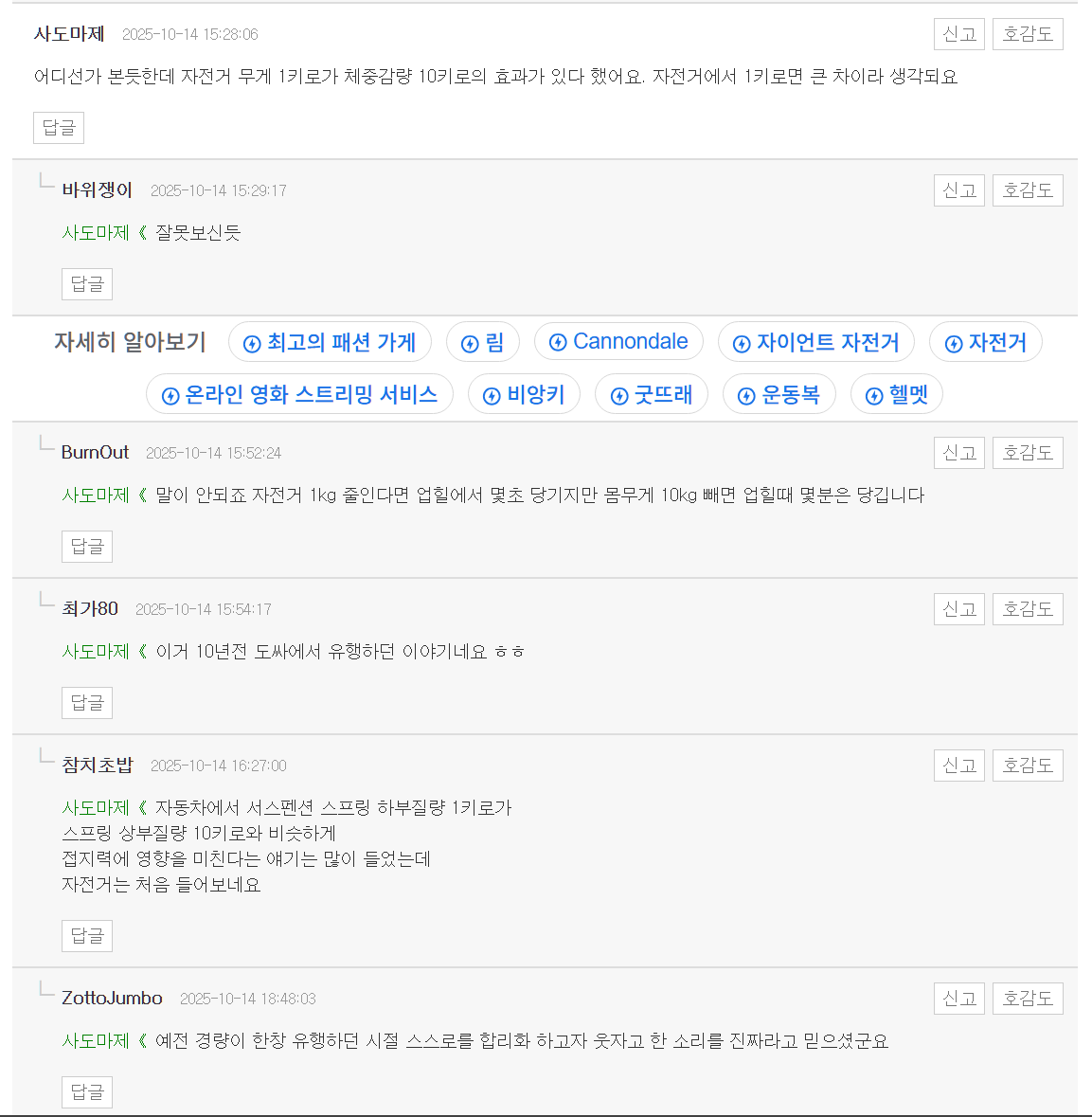 도싸 같은데 가서 기함급으로 자전거 무게 / 몸무게 어쩌고 한번 해서 동조하는 분 있나 보시길.. ㅋㅋㅋㅋㅋㅋㅋㅋ | 25.10.15 15:55 | |