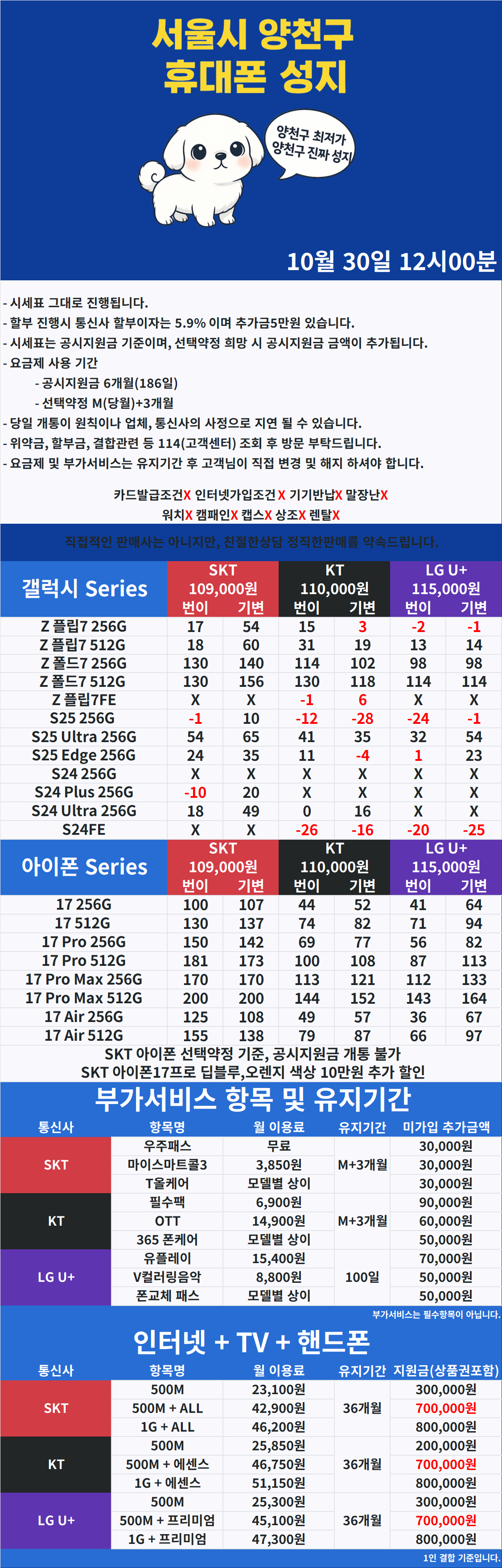 🟦 10월 30일 기준 실시간 단가표 🟦
