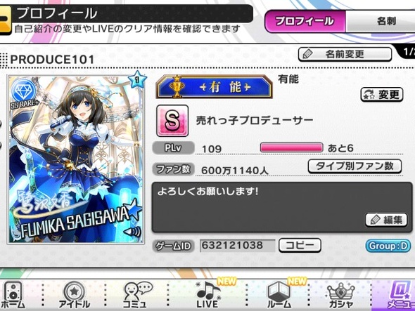 데레스테 1주년과 데레마스 4th 공연 이후인 2016년 말 이후로 다른 계정으로 갈아타면서 오랫동안 긴 동면기를 거치다가