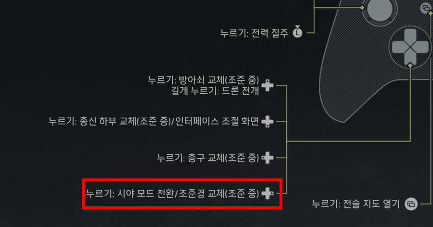 게임패드 설정에서는 시야 변경 버튼이, 조준 중에는 조준경 교체 기능으로 동작합니다. 시야 변경 버튼을 별도의 버튼으로 분리해서 설정하시면, 조준 중에 시야 변경이 가능할 껍니다. 키보드+마우스 사용하시면 기본으로 분리되어 있습니다(시야모드 변경=V, 조준경 교체=B)