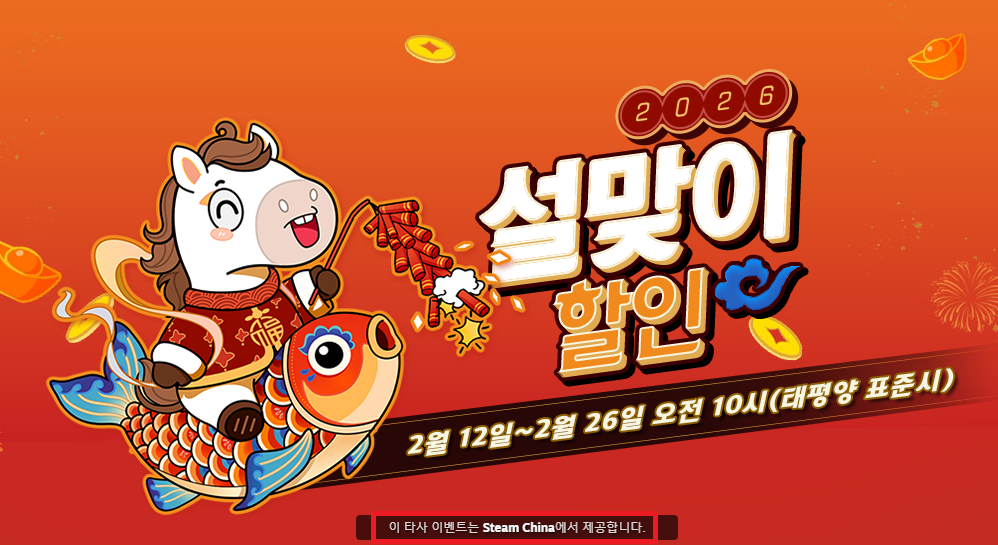 그림 보니깐 lunar new year보다 china new year 개념인 듯. 한국설날 이벤트가 아닌 중국설날 이벤트. 그림도 중국 설날 폭죽그림이고.... 그리고 개발사 개별 할인이벤트도 많네요 | 26.02.15 07:49 | | |