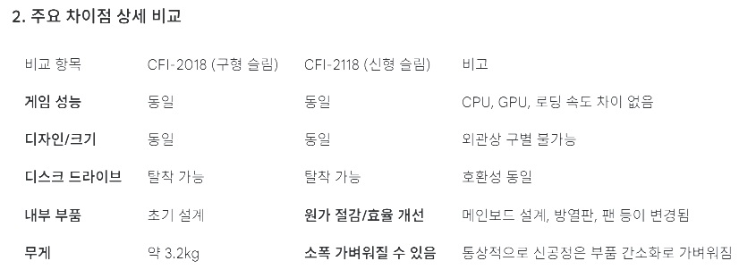 소니는 플레이스테이션 모델명을 CFI-[세대][공정][국가] 순서로 표기합니다. 18 (맨 뒤 두 자리): 한국 정식 발매 제품을 의미합니다. (두 모델 모두 한국판) 20 vs 21 (앞 두 자리): 제조 공정 및 내부 부품의 리비전(개선) 번호입니다. CFI-2018: PS5 슬림의 초기 출시 모델 CFI-2118: PS5 슬림의 마이너 개선(리비전) 모델 제미나이에게 물어봄. | 25.11.20 16:28 | | |