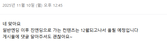혹시나 해서 다른 드퀘전문 유투버님께 물어보니 자기도 그 사실을 알고 있어서 12월달에 올릴려고 계획하고 계신다더군요 다른 분들이 이렇게 신경쓰고 노력하는데 저런 분은 참... 그렇네요 | 25.11.10 14:17 | |