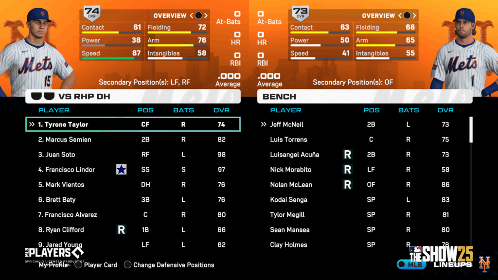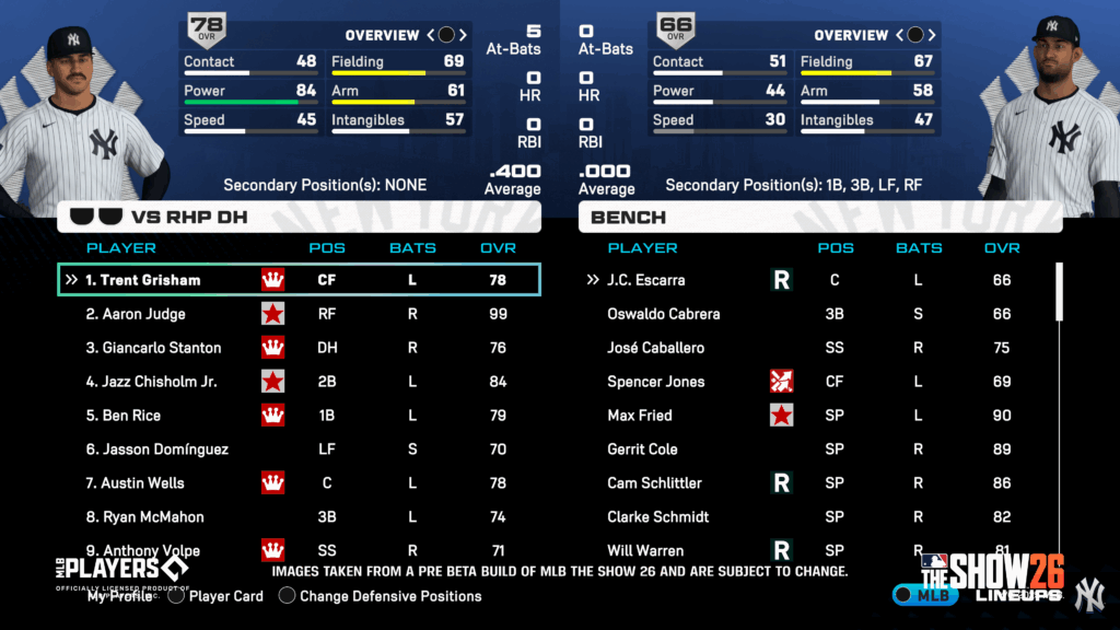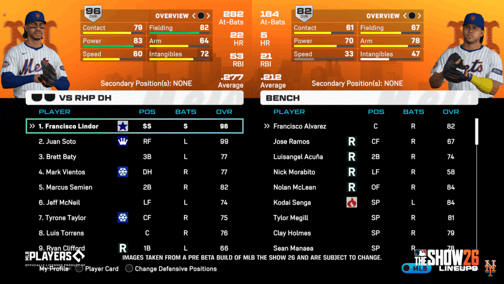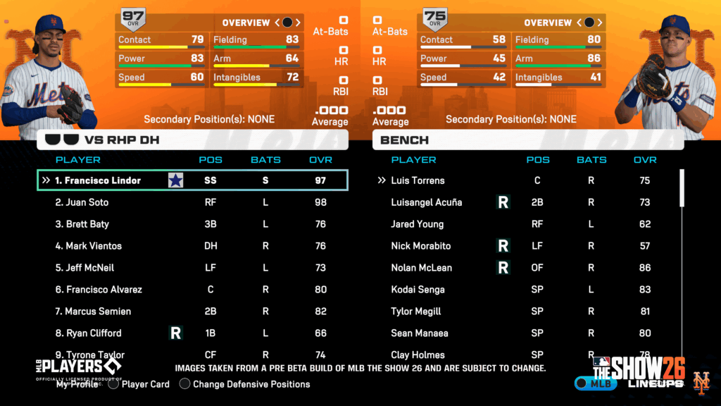'26 시즌의 새로운 라인업 로직을 살짝 엿보겠습니다. 왼쪽 두 스크린샷은 MLB The Show 25의 기존 라인업 로직을 보여주고, 오른쪽 스크린샷은 MLB The Show 26의 개발 중인 버전입니다.