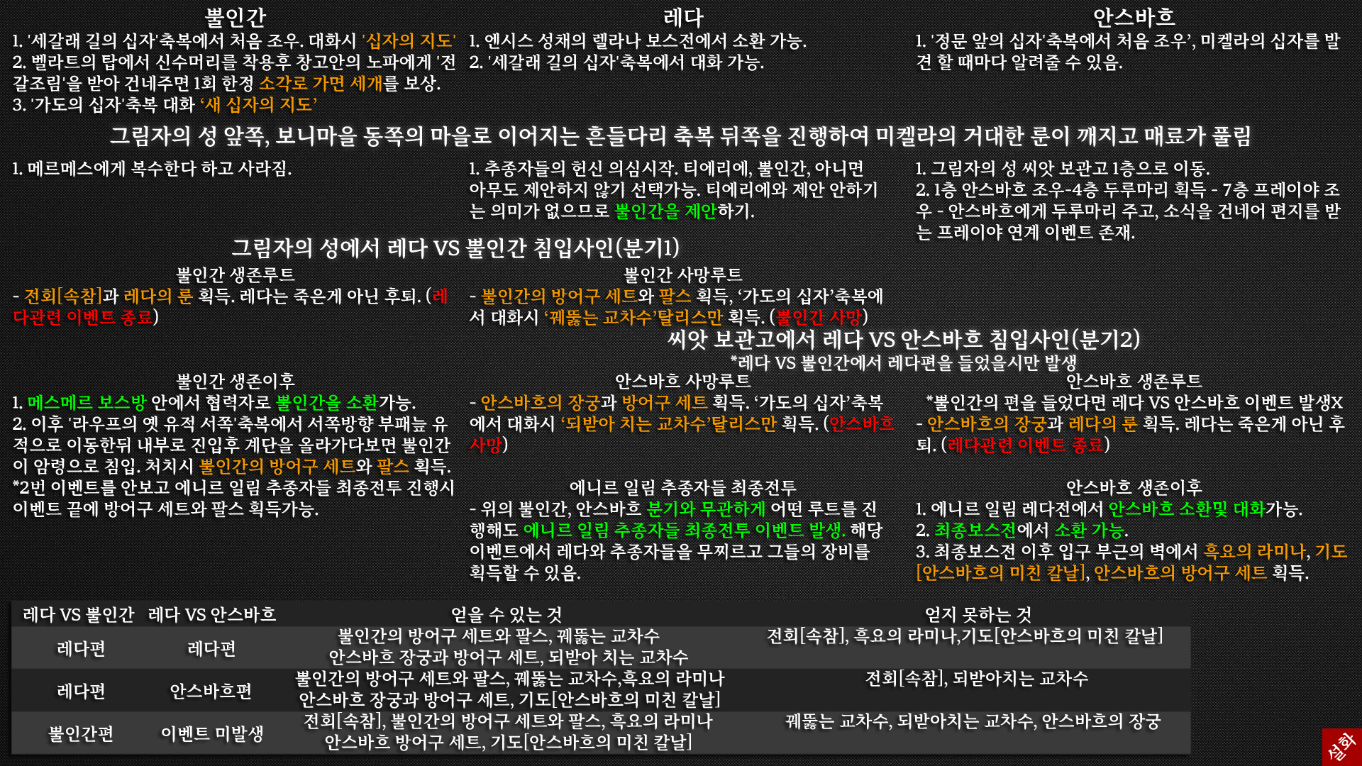 암령 사인으로 침입을 하는게 무기를 얻는 퀘스트. 모그윈 왕조 시작지점에서 맵상 좌하단 피웅덩이 막 올라오고 엄청 큰 새들 나오는곳에서 백면 바레가 아닌 이름없는 백면이었나로 그 웅덩이 구간에서만 세번 침입이 옵니다. 세번쨰 처리할 시 방어구 드랍. 5. 피아를 D의 동생이 살해한다는 트리거 자체가 피아 이벤트 완료 이후에 죽음룬 먹고 발생을 합니다. 이는 제렌->셀렌 본체 원휘석 퀘스트와 동일한 구조며 제렌이 셀렌을 죽인다고 오는것 자체가 셀렌의 원휘석을 얻은 뒤 나오는것과 동일한것으로 보여집니다. | 22.03.10 14:14 | |