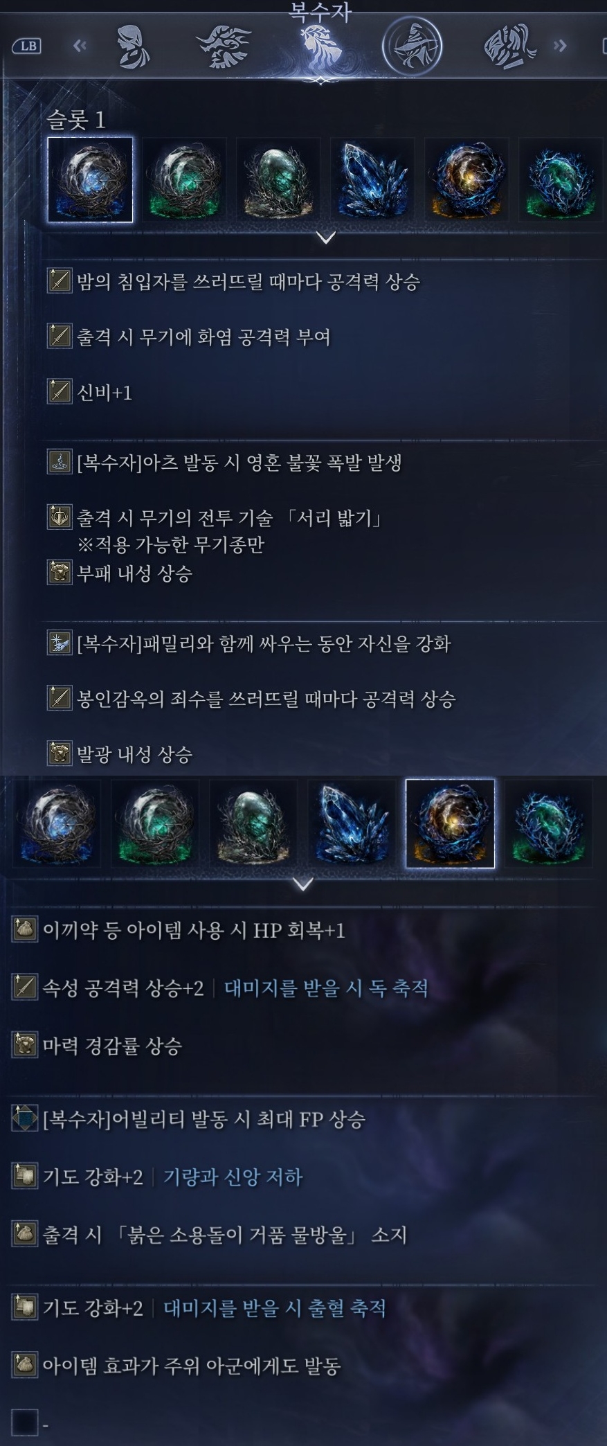 전 일반 유물쪽은 봉감밤침+무한 동상 자력 콤보용이라 더 건드릴수가 없고 심도쪽에 기도나 속성에 적당한 적처치시 아츠 게이지 증가 0, 1만 추가하면 완성인거 같은대 구경하기가 힘드네요 ㅠㅠ