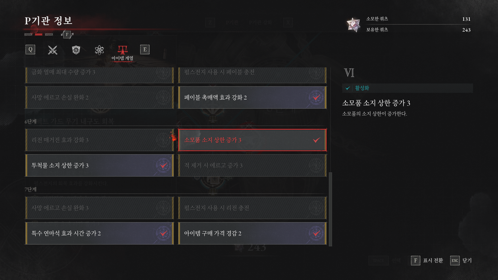 소모품 소지 상한 3까지 다 찍으셨어요? 3/4 인데 꺼내지 못하는거면 버그지만 3/3 이면 쿼츠를 덜찍으신걸꺼에요 저는 최고회차캐릭이라 다찍어져있어요 최대 3레벨이에요 | 25.06.26 09:16 | | |