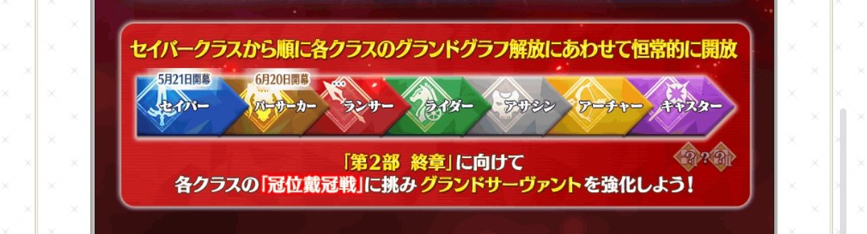 대관전 순서는 초기에 다 깠음 세이버, 버서커, 랜서, 라이더, 어새신, 아처, 캐스터 순서임