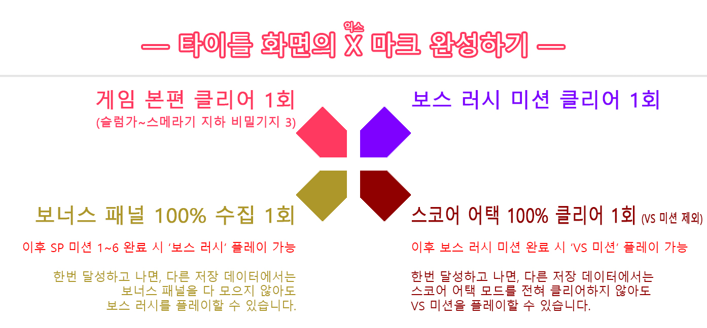 타이틀 화면의 우측 상단에 있는 익스 마크에 관해서는 나중에 좀 더 자세히 다루겠습니다.