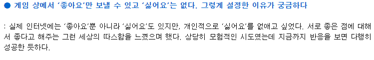 ● 게임 상에서 ‘좋아요’만 보낼 수 있고 ‘싫어요’는 없다. 그렇게 설정한 이유가 궁금하다