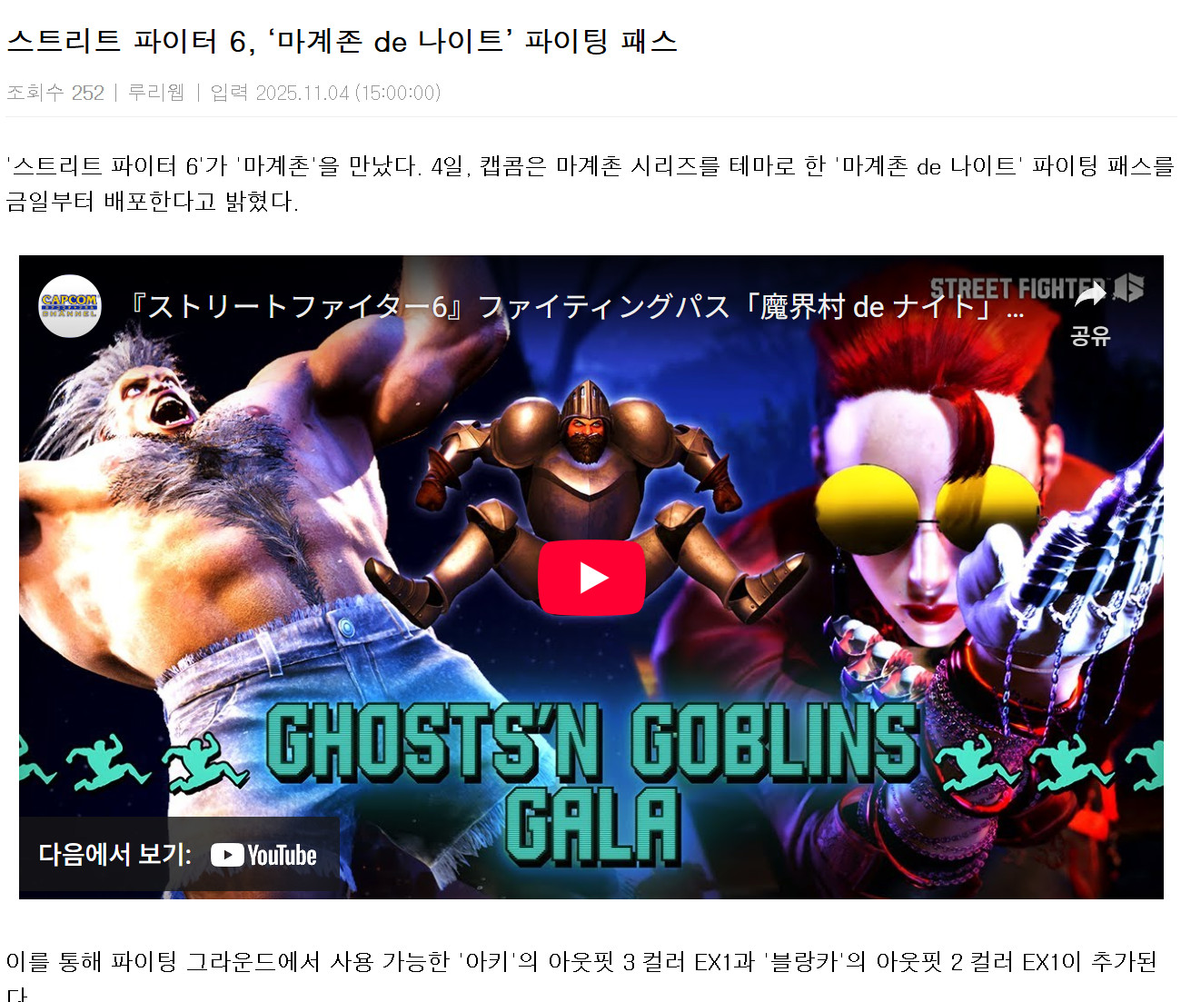 '스트리트 파이터 6'가 '마계촌'을 만났다. 4일, 캡콤이 마계촌 시리즈를 테마로 한 '마계촌 de 나이트' 파이팅 패스를 금일부터 배포하기로 결정한 것.