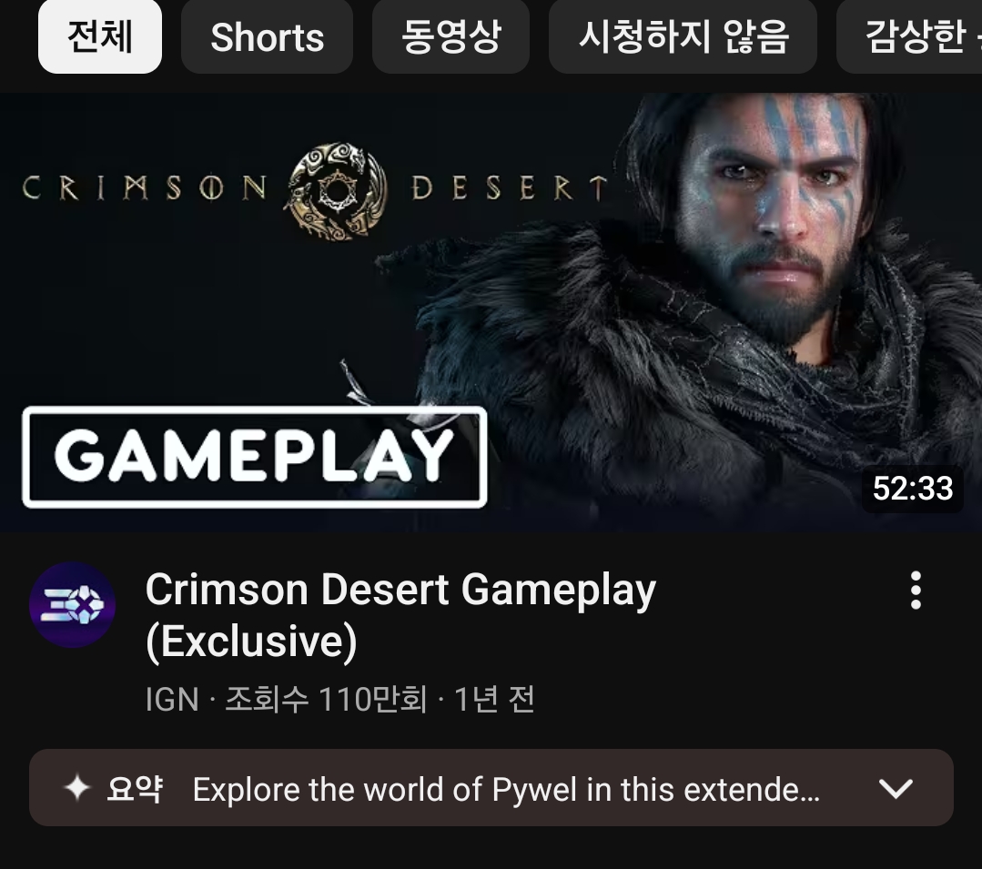 33원정대 9개월전 트레일러 조회수 138만 펜텀블레이드 1개월전 영상 조회수 749만 붉은사막 4개월전 트레일러 조회수 43만 | 26.01.30 14:31 | | |
