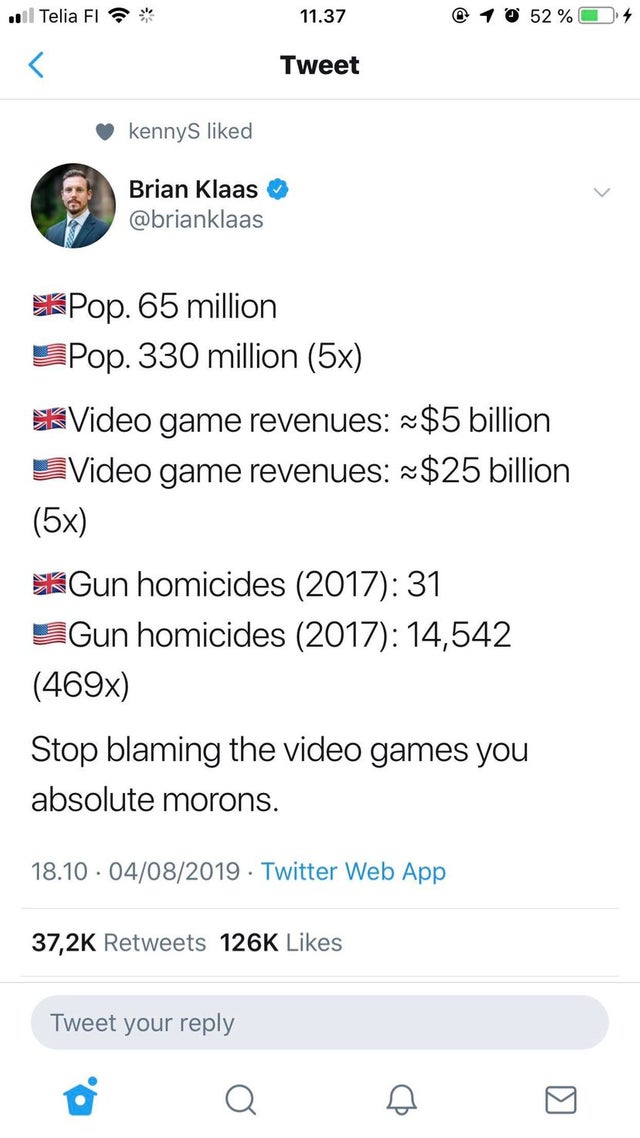 미국인구 = 영국인구 5배 미국게임시장 = 영국게임시장 5배 미국 총기사망자 = 영국 469배 비디오게임한테 책임 떠넘기지 마라 트럼프 뿅뿅shake야. | 19.08.06 13:07 | | |