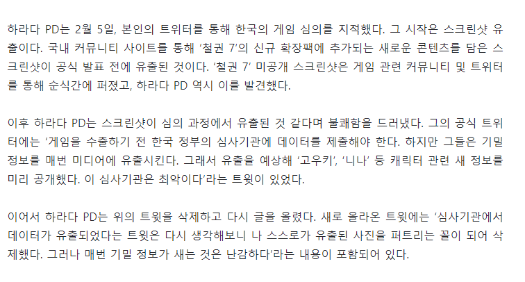 하라다 트윗을 여기에 들고오기엔 좀 적절하진 않지 게등위 욕한 건 스샷 등과 같은 정보 유출 포함해서 최악이라고 한 것인데 실제 저 당시 스샷 유출한 건 게등위가 아니라 디시유저임 하라다가 단순히 심의 발표로 같은 생각을 가지고 있는지 아닌지는 모름 | 22.09.26 18:54 | | |