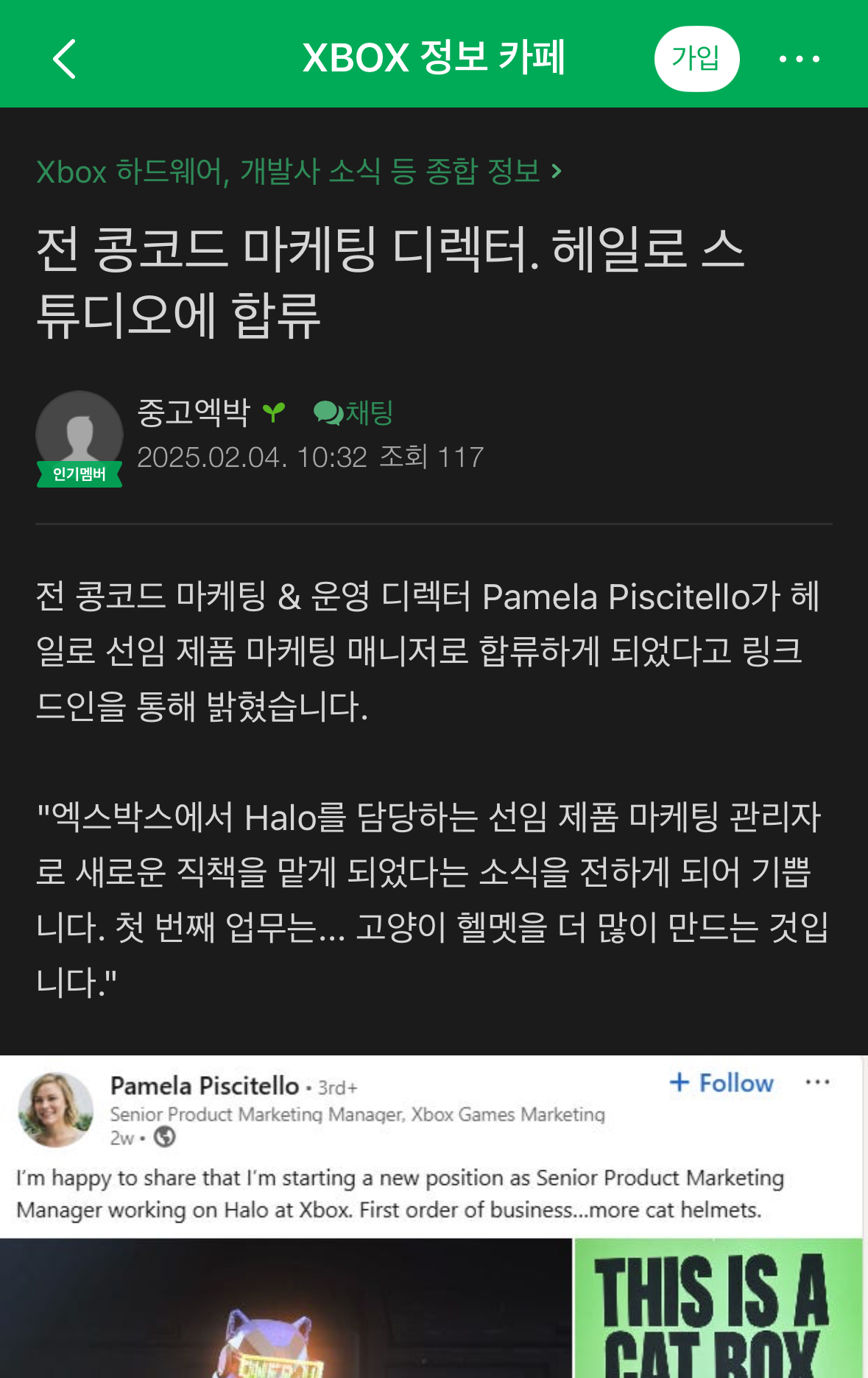 재목 : [제작사] 전 '콩코드' 디렉터, 헤일로 스튜디오에 합류 본문 : Firewalk Studios와 Concord 게임 의 마케팅 및 운영 책임자인 Pamela Piscitello가 공식적으로 Halo Studios에 수석 제품 마케팅 관리자로 합류했습니다. | 25.02.04 11:40 | | |