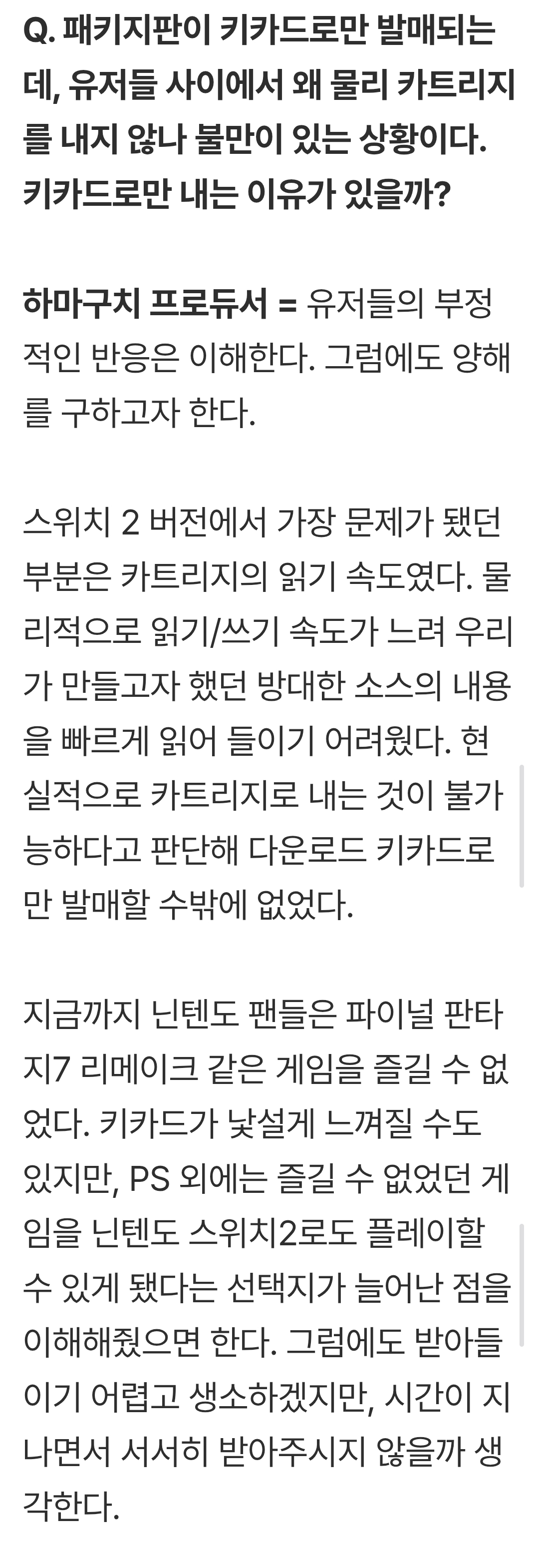 용량의 문제가 아니라 돈의 문제입니다. 단가 비싼 풀카트리지를 사용하느냐 마느냐가 문제지, 데이터 크기는 의미가 없습니다. 업글도 마찬가지인데, 스위치2 에디션으로 파는 게임들은 키카드를 사용할 수가 없습니다. 에디션은 스위치1에서도 돌아가야 하거든요. 그래서 어떤 게임들은 스위치2 패키지 발매릉 포기하고(하늘의 궤적) 어떤 게임들은 아예 다운로드 코드 방식으로 게임을 냅니다(파판 택틱스). 다운로드 코드 방식은 키카드보다 더 별로죠 참고로. | 25.11.25 18:16 | | |