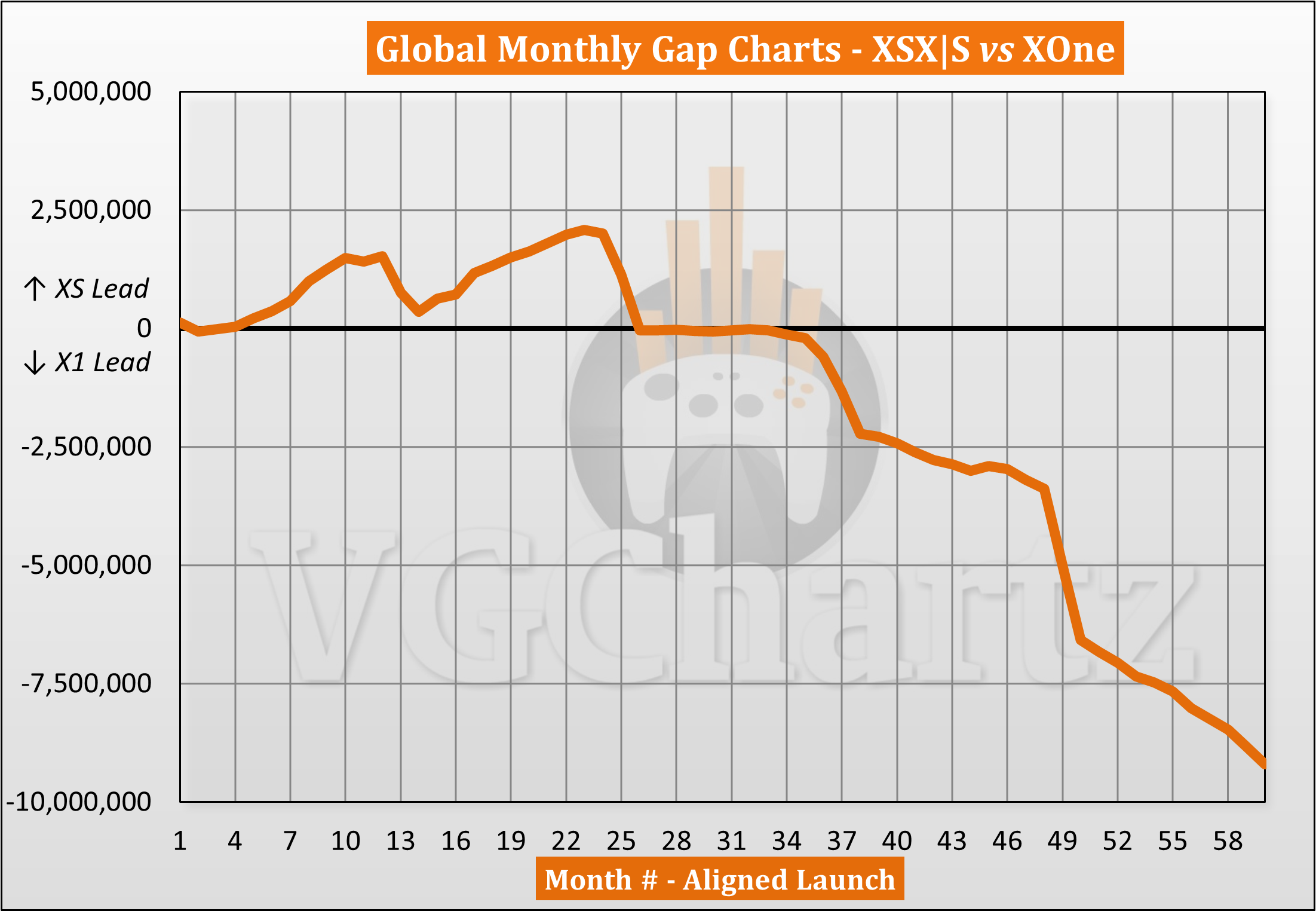 Xbox One은 62개월차에 4,500만 대, 71개월차에 5,000만 대, 77개월차에 5,500만 대를 돌파했습니다. Xbox One은 누적 판매량 5,796만 대를 기록했습니다. Xbox Series X|S는 누적 판매량보다 2,408만 대 뒤처져 있습니다.