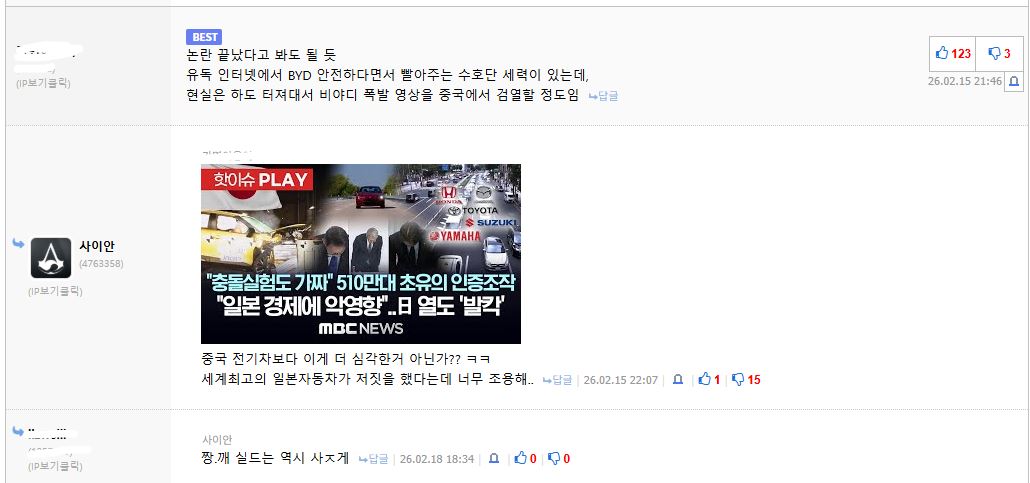 반일이라는거보면 어디 일본 혐한쪽에서 오셨나?? 팩트뉴스인데 반일이라뇨?? 중국이야 공산국가고 아직 수준이 미개해서 베끼고 난잡한거 이해한다지만 일본은 강대국이고 선진국이고 민주주의 국가잖아요.. 쉴드칠걸 쉴드치셔야죠 | 26.02.18 19:09 | | |