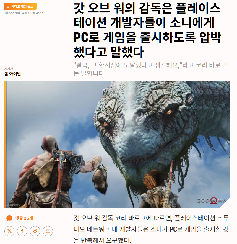 "PC로 출시되는 싱글 플레이어 게임이 줄어들 것입니다. PC 지원에서 벗어나기로 한 결정은 지난해 내려졌습니다. 당연히 일부 게임은 여전히 출시될 수 있지만(포트 작업의 진행도에 따라), 앞으로 소니에게 더 이상 우선순위가 아닌 것으로 보입니다."