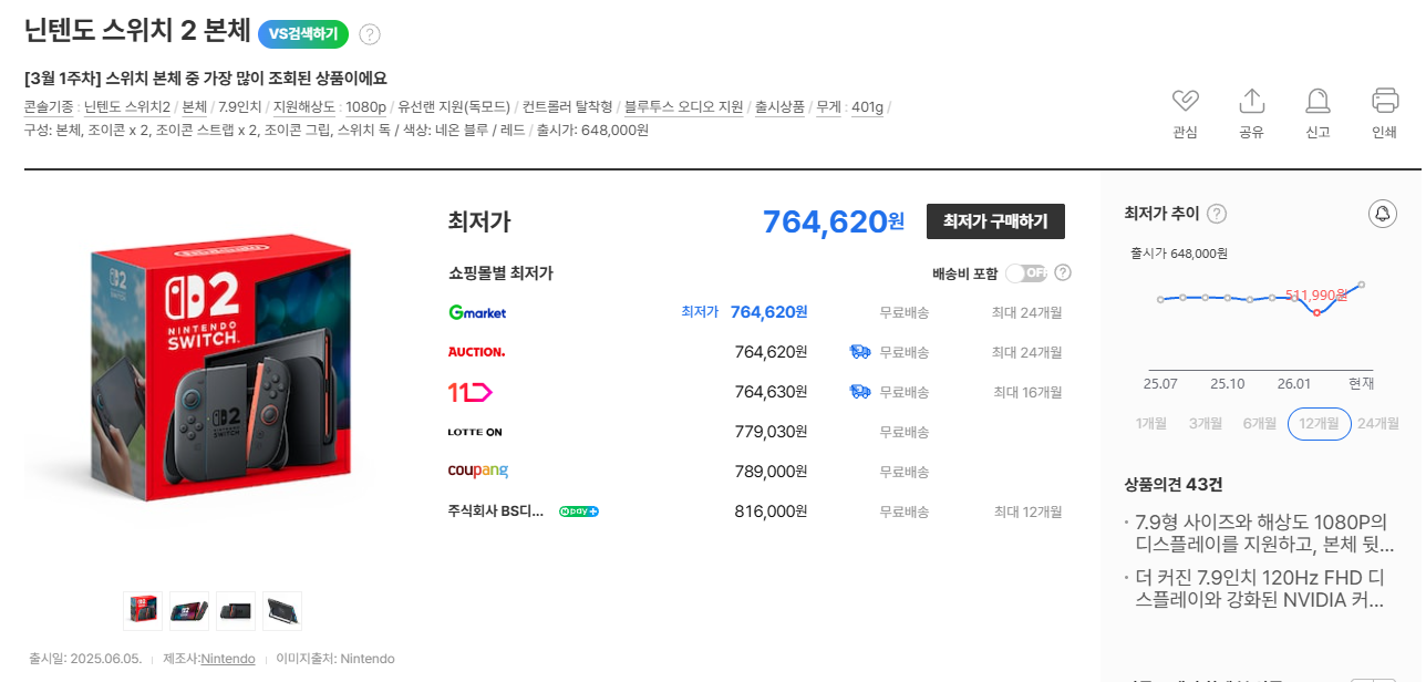 다나와 가보니 스위치 2 764,620원?!?! 정가 대비 18% 상승했군요 허허