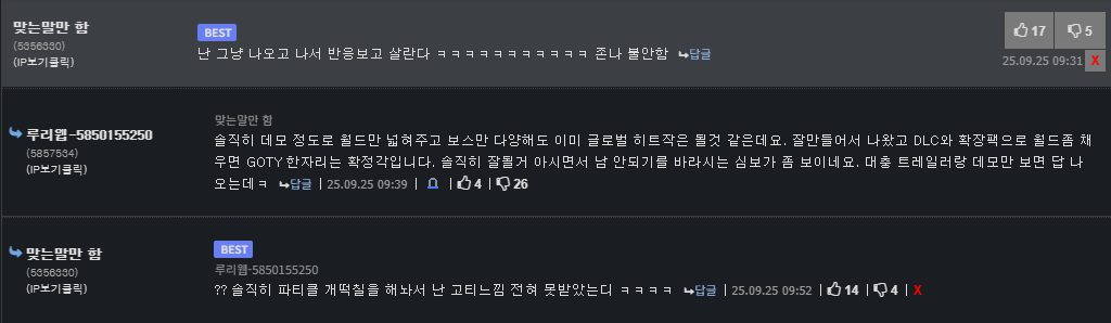 원래 체험에서 까는 애들 거의 없음. 거기다 이런식으로 개발 질질 끌면서 나온 겜중에 제대로 나온 게임이 없음. | 26.03.19 08:05 | | |