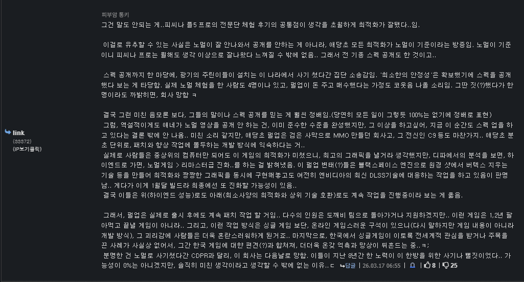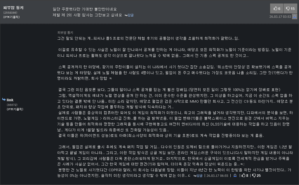 스블, 피의거짓은 진짜 많이 잘만듬... 걍 펄어비스가 못하는 거 | 26.03.19 07:59 | | |