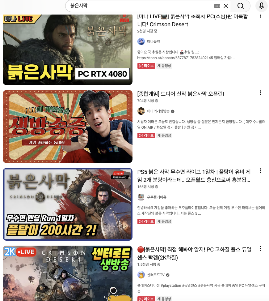 유튜브에 붉은사막 검색했더니 지금 라이브 진짜 엄청나게 많네...ㄷㄷ 다들 게임하고 있어서 여긴 조용한가보네..