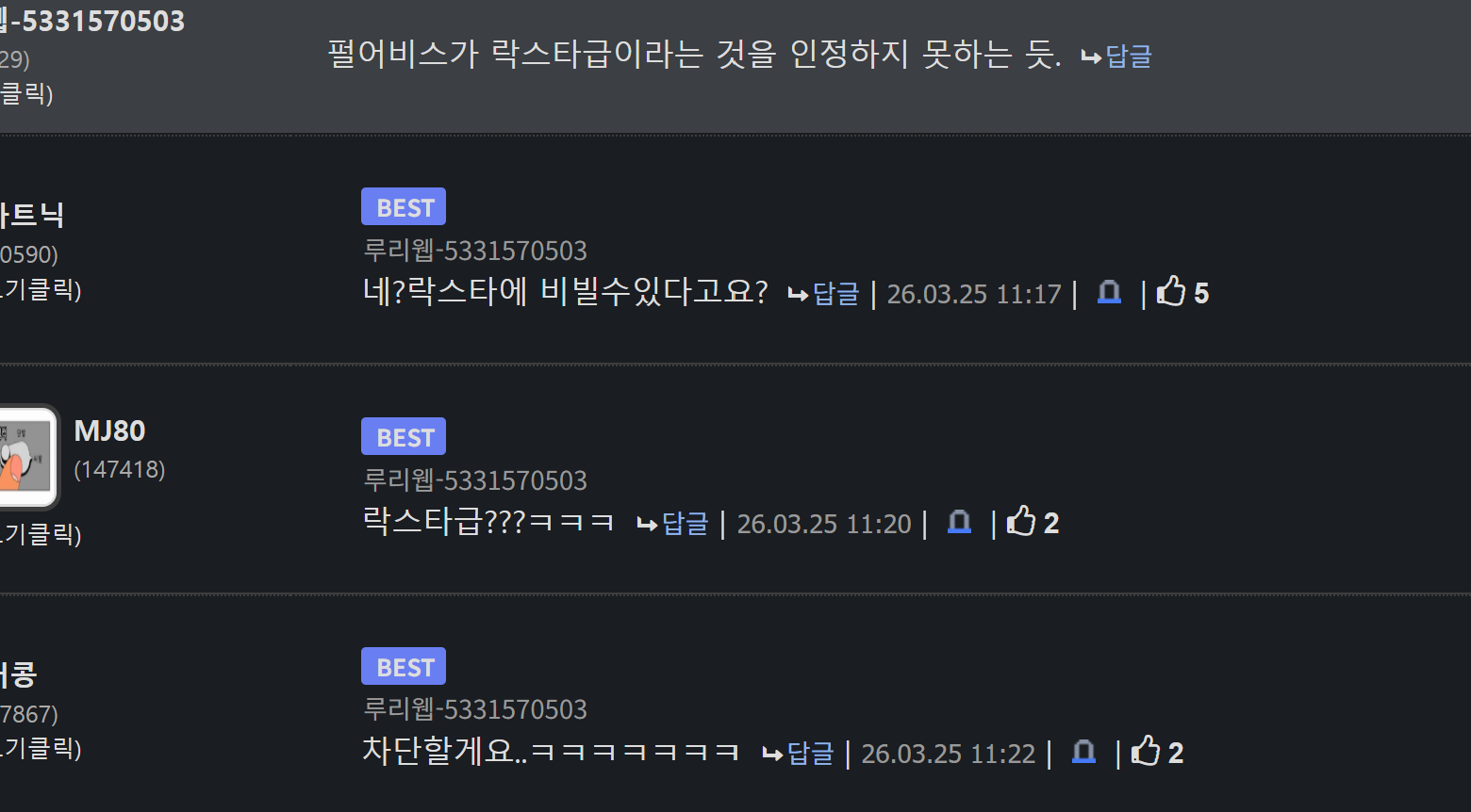 어제 풍월량 방송에거 억까짓 분탕치다가 풍월량 한테 쓰래기 소리 들음...ㅋ | 26.03.25 12:48 | | |