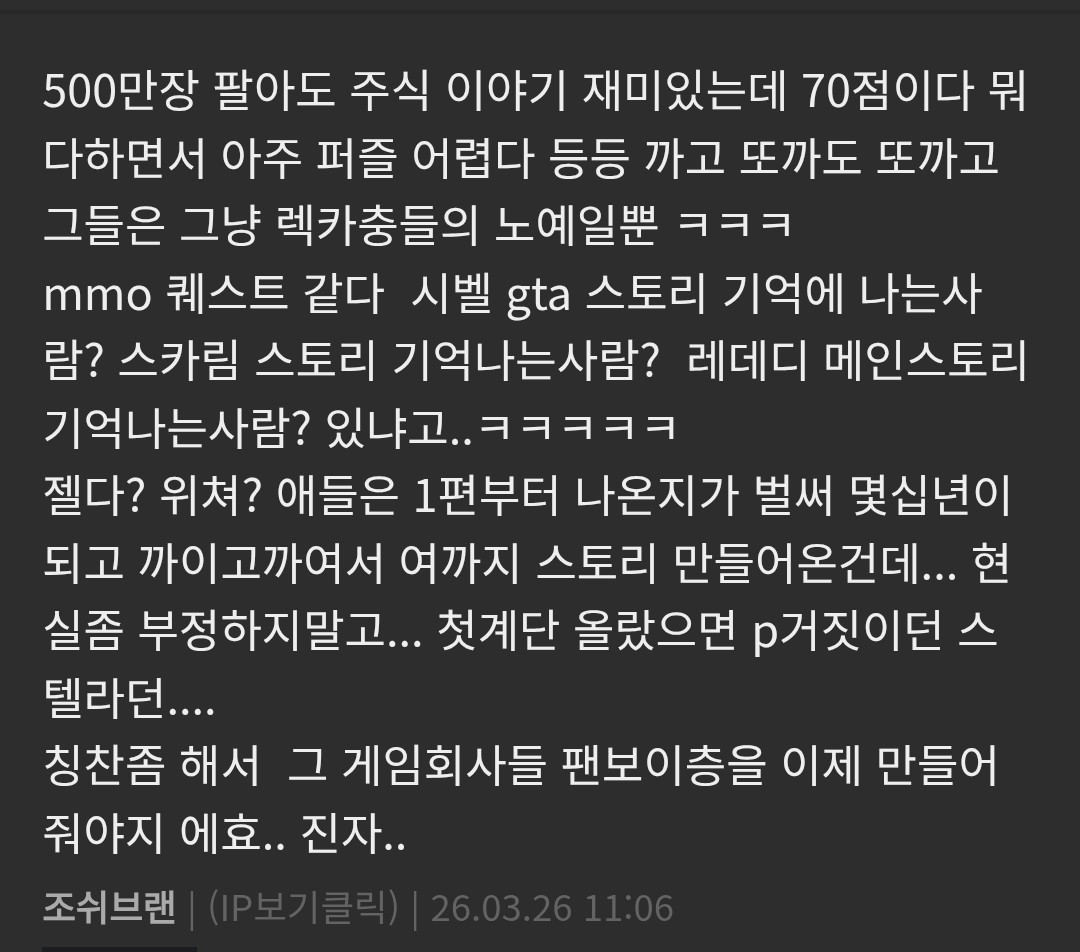 조작감 부분에선 불편하긴 했지 근데 개똥겜 취급 받을 정돈 아니였으나 인방러들 손절하네 ㅋㅋ 주가 폭락 개똥겜 ㅋㅋㅋㅋ 이럴땐 억까하는거 당연 지금 인방러들 아씨 왜 재밌지? 주가 회복하고 전세계적 평가 오르고 있어서 재밌다는평 많아지니 억빠 불편 .. 뭐가 이상하지 않음? 억까는 정당하고 억빠는 불편 ㅋㅋ | 26.03.28 10:16 | | |