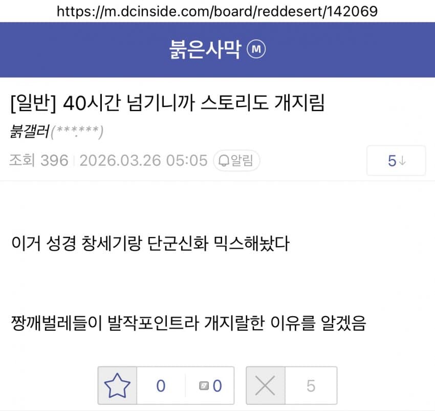 난 단순히 재밌어하는 애들 억빠로 몰아간적 없음 걍 니가 계속 쉐도우복싱 하고있는거지 별로 보이지 않는다? 그건 뭐 니 주관적으론 그럴수도 있는지 모르겠는데 지금 당장은 억까보다 억빠가 더 많이 보이고 그럴 수 밖에 없는 시점임 뭐 인터넷이니까 여론따라가는건 어쩔 수 없긴한거고 상황자체는 걍 자연스러운거 처음부터 지금까지 나는 붉은사막 깐적도 없고 빤적도 없이 걍 억까나 억빠나 다 존재하고있고 양쪽 다 문제있는거다라는 말만 하고있는데 니 혼자 이해력이 나락가서 헛소리만 계속 하고있음 | 26.03.28 12:09 | | |