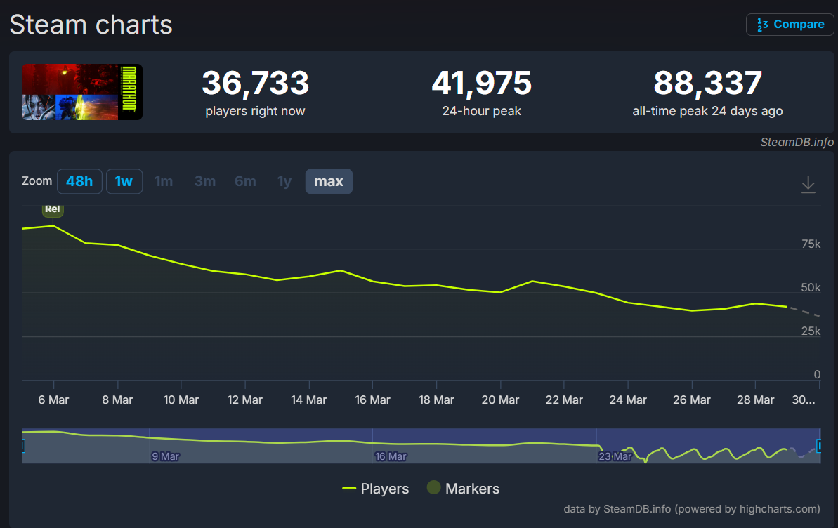 이전에 흥행에 크게 실패했던 '콘코드'나 '하이가드' 같은 게임들 때문에, 일각에서는 번지가 '마라톤'의 서비스 지원을 조기에 포기하는 것 아니냐는 우려 섞인 추측이 나왔습니다.