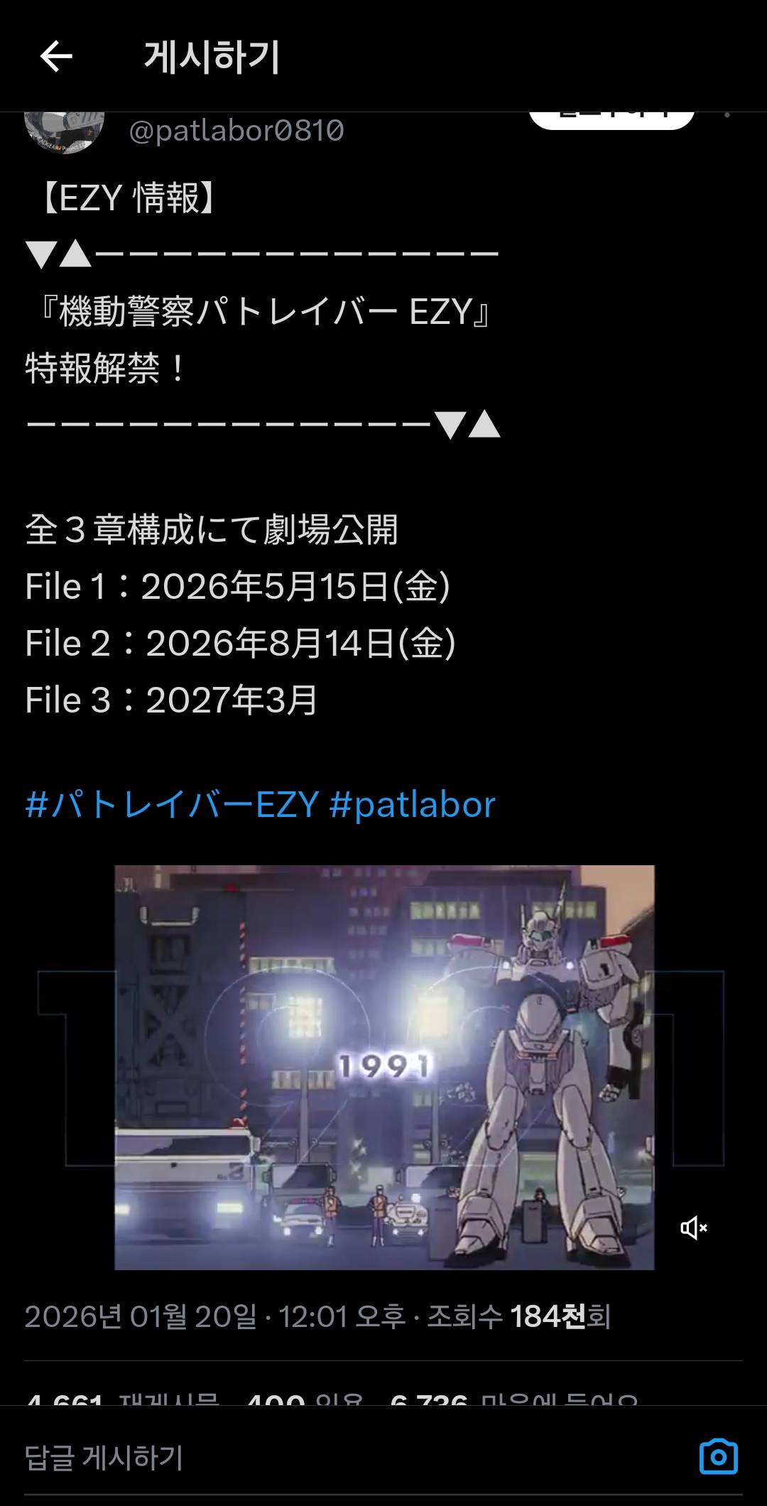 방금전에 패트레이버 신작 공개 정보 나왔거든요 | 26.01.20 13:24 | | |